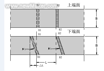 上半圖直尺傳動中,一對齒輪在B2B2和B1B1處進入和脫出嚙合,其嚙合區(qū)為L.下半圖斜齒傳動中,也是在B2B2處進入嚙合,但是在齒寬方向是逐漸進入嚙合的,同樣在B1B1處脫離也是逐漸的,這樣其實際嚙合區(qū)比直齒的嚙合區(qū)增大了ΔL,因此其齒面接觸狀況更好。